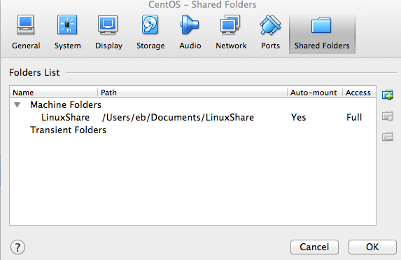Download CentOS, create a centOS virtual machine and configure the virtual machine (VM) with a shared folder as below (make sure Auto-mount is set to Yes)